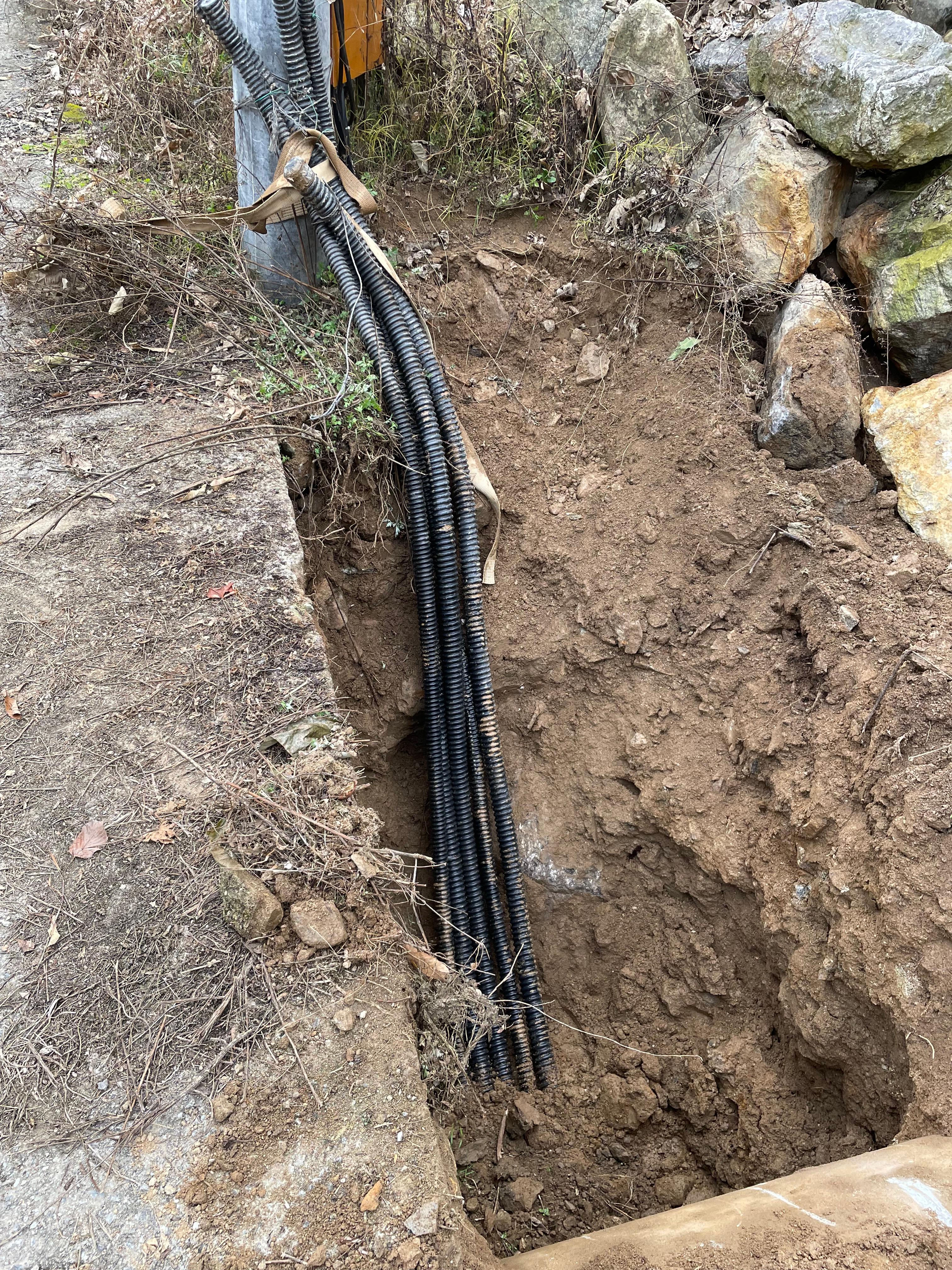 우수관로 밑으로 주름관을 넣기 위해 땅을 최대 2,5,m 이상 깊이로 파고 CD관 5개를 우수관로 밑으로 밀어 넣어 전봇대 밑까지 뽑아 올렸다.