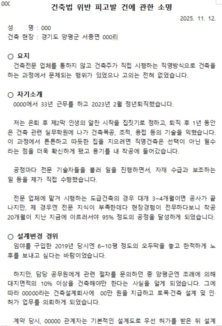 설계변경 허가를 받기 전에 공사를 했다고 양평군청으로 부터 지난 8월 과태료 처분을 받은 바 있다는 글을 올린 적이 있다.