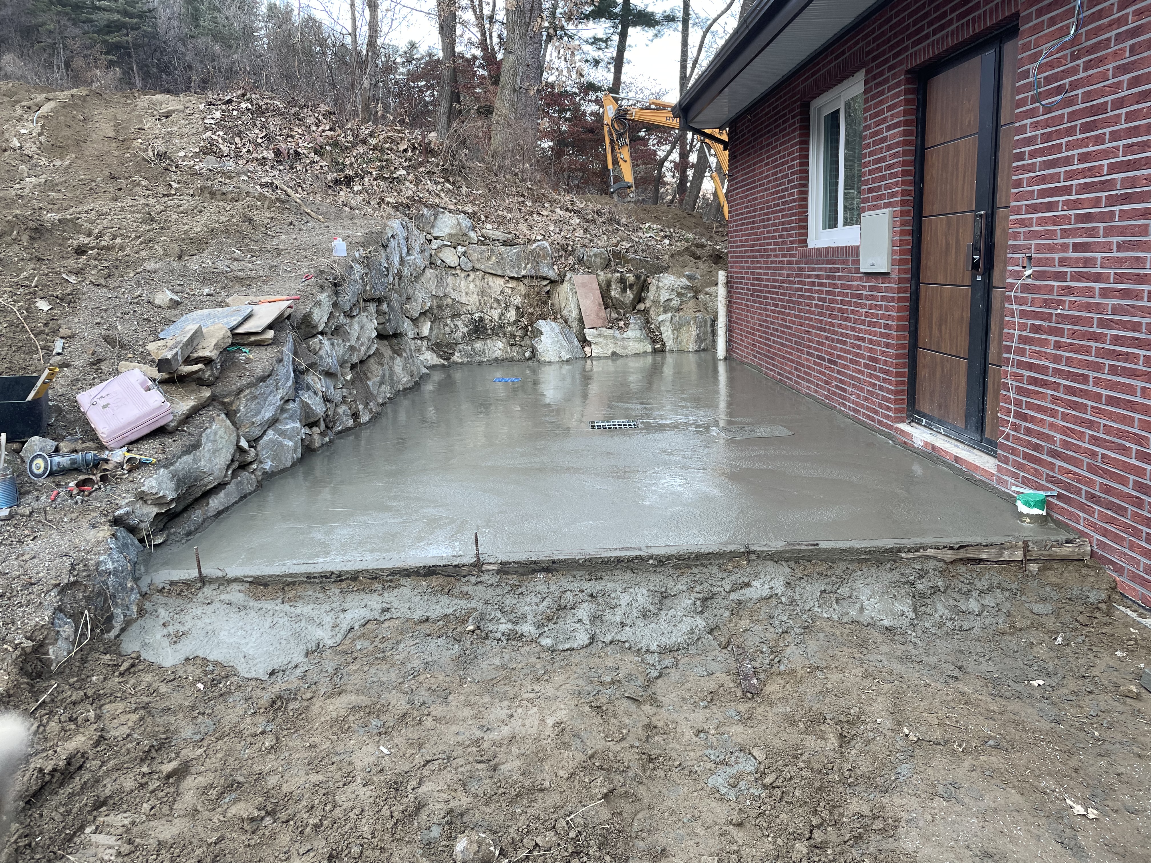 현관쪽 마당 일부, 정화조 맨홀과 집밖 도로에 설치한 전기통신 맨홀 주변 콘크리트 포장작업도 진행했다. 여기에 들어간 레미콘이 6루베 (㎥)다.