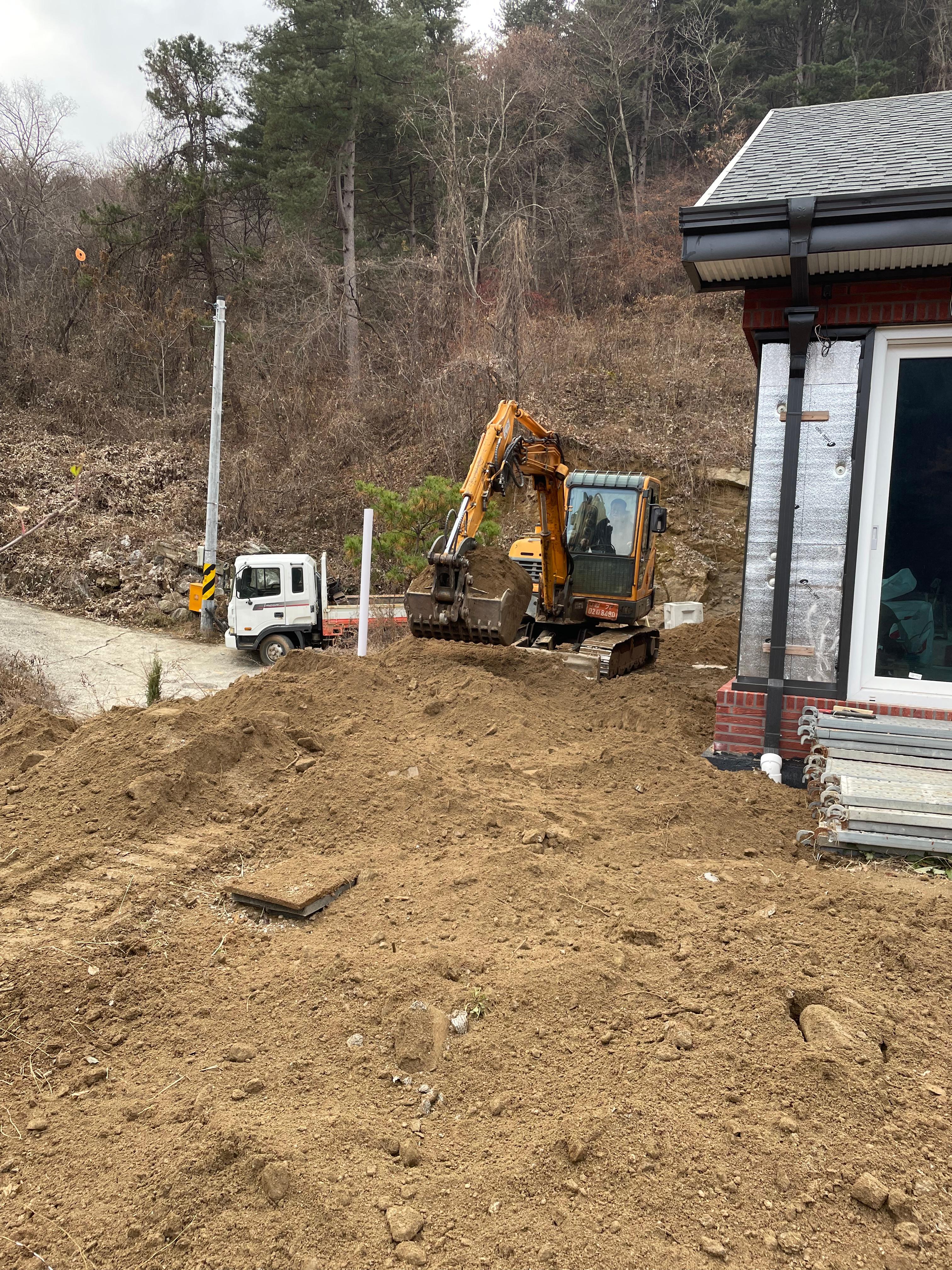 성토를 위한 흙은 뒷쪽 윤 소장 땅에서 마사토를 끌어내려 썼다. 외부에서 흙을 받는 방법도 있겠으나, 당장은 가까운 데서 좋은 흙을 받을 수 있는 곳이 없었고 덤프트럭으로 실어온다고 해도 앞쪽 마당으로 진입공간이 협소해 효율적인 작업진행이 어려울 것 같아 이런 선택을 한 것이다.